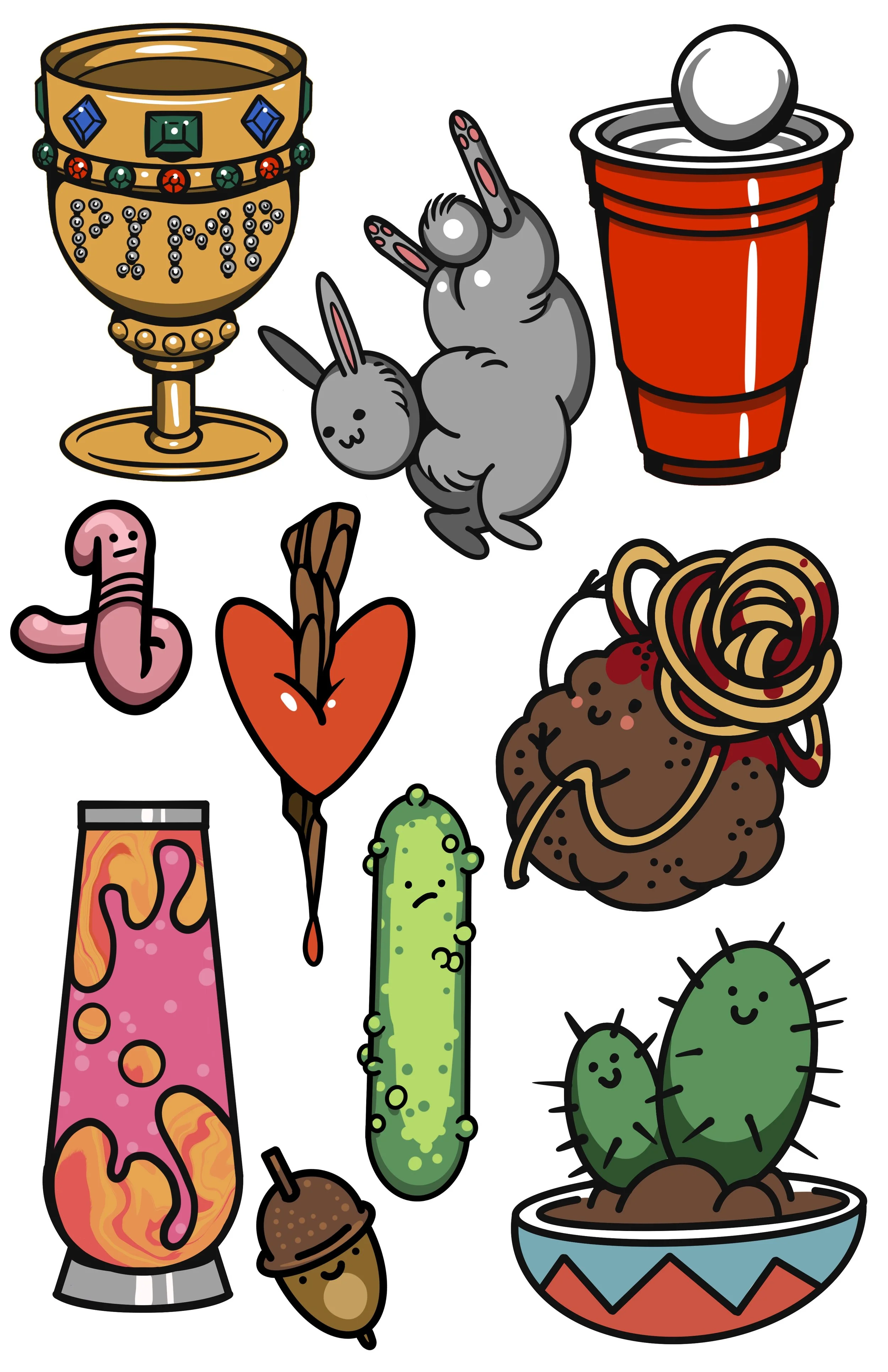 A collection of simple tattoos with subjects like a pimp cup, red solo cup, a worm and a pickle