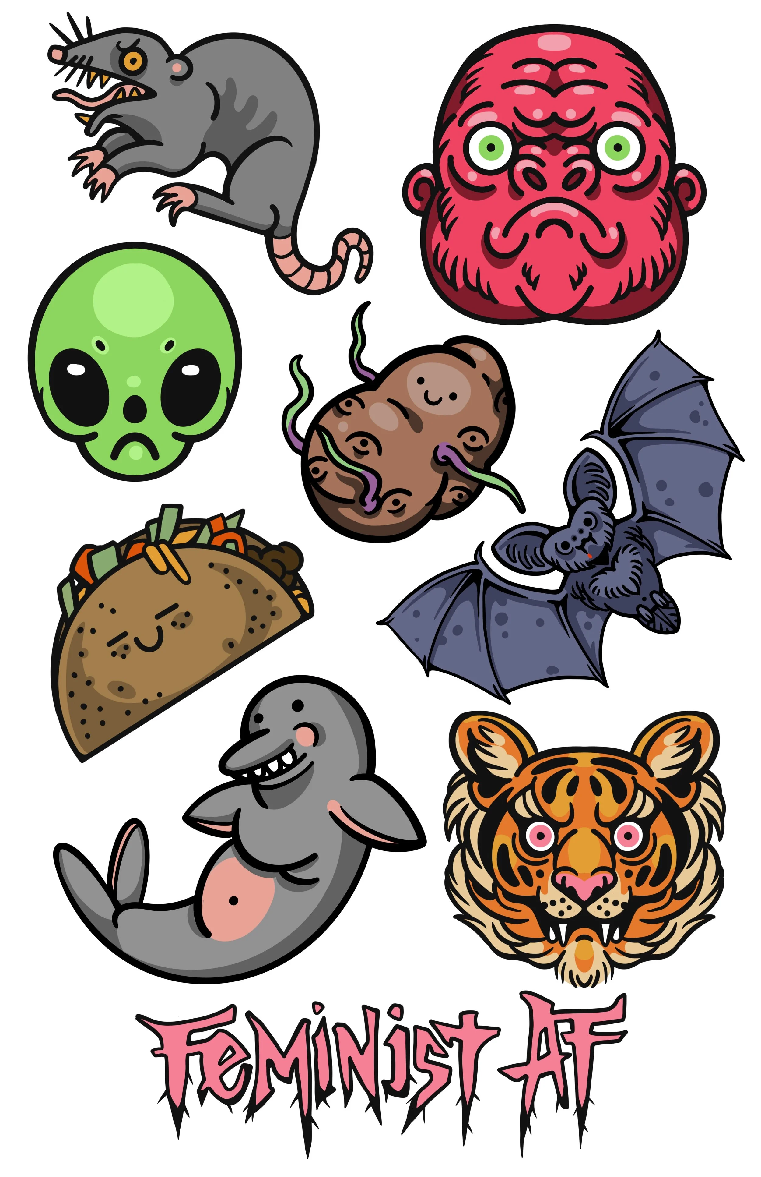 Simple tattoos with images of a rat, gorilla, tiger and potato.